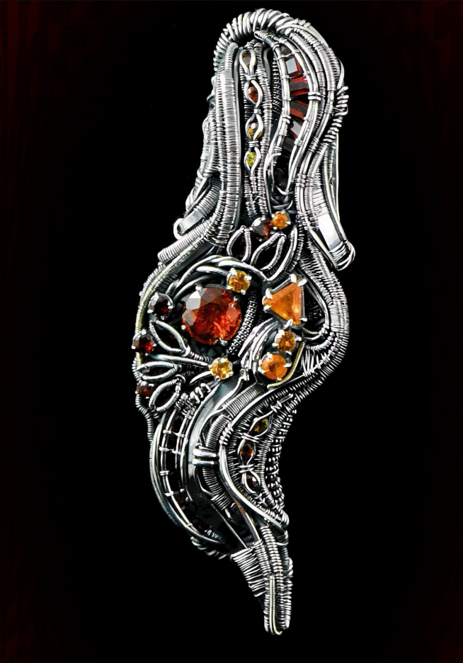 Hand-fabricated using my Sparks shard-weaving technique with petals and prongs, channels and extensive additional wire-weave layers and structural reinforcement. Base heavy-gauge wires keep it strong and sturdy while various-gauge details accent the fiery gems. The back is fully finished and polished.