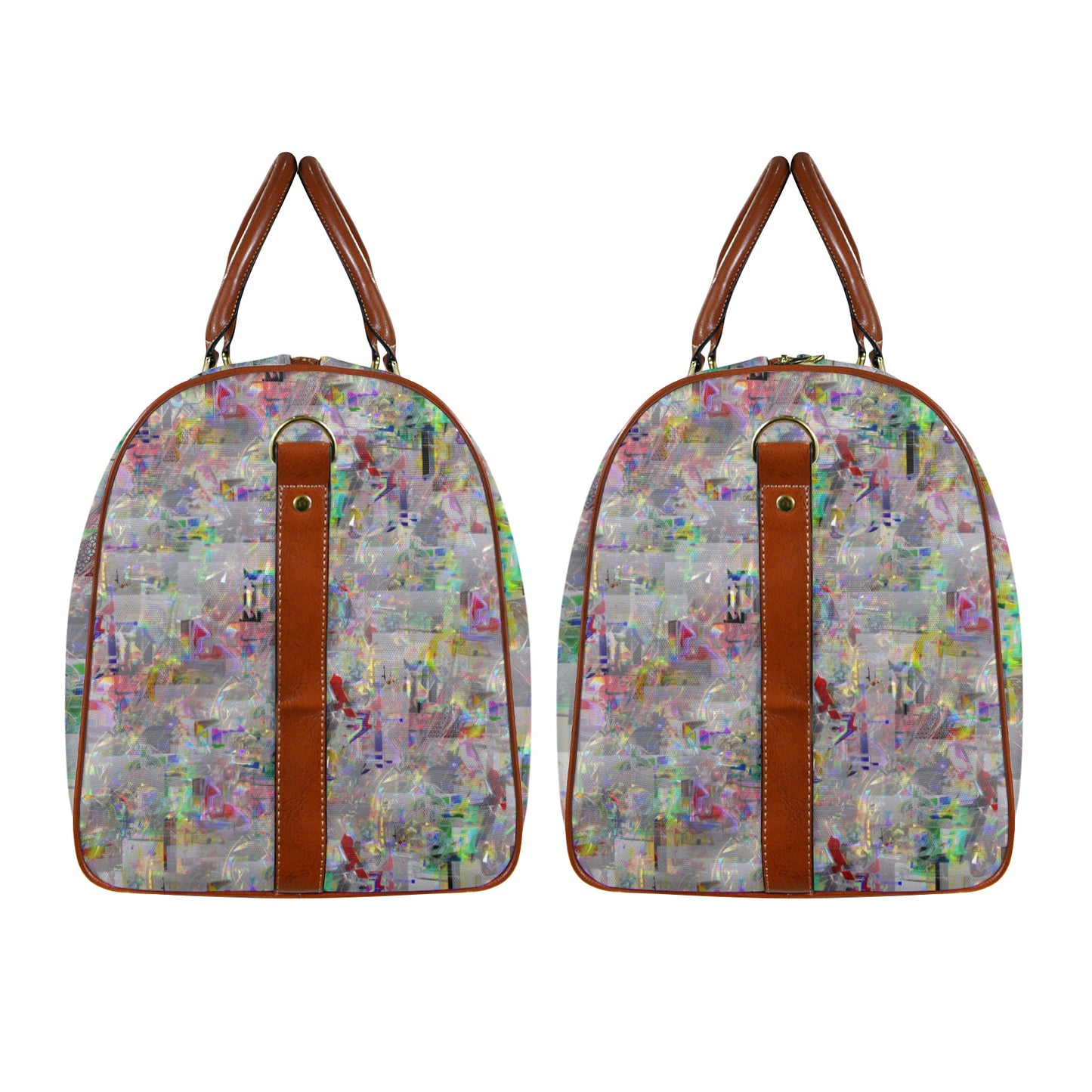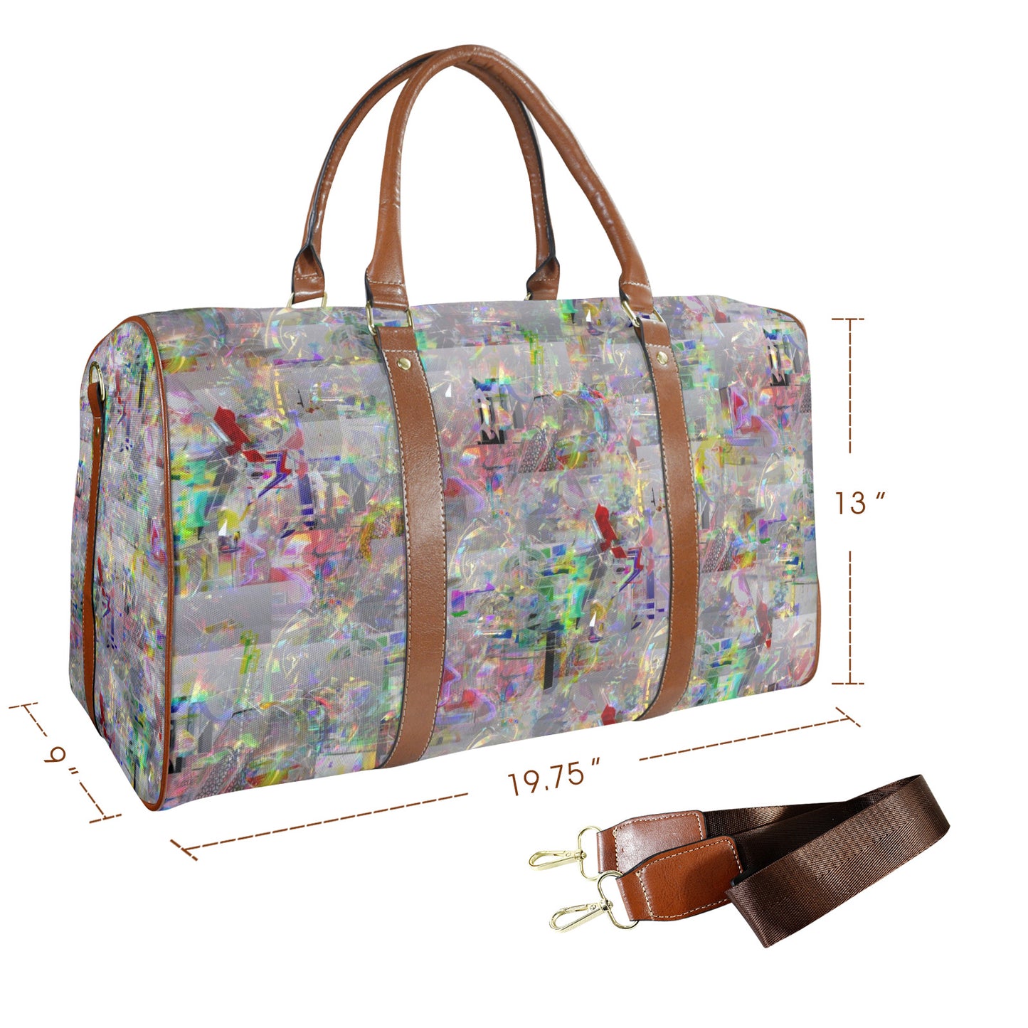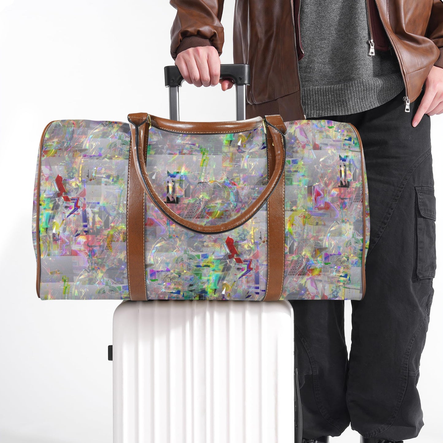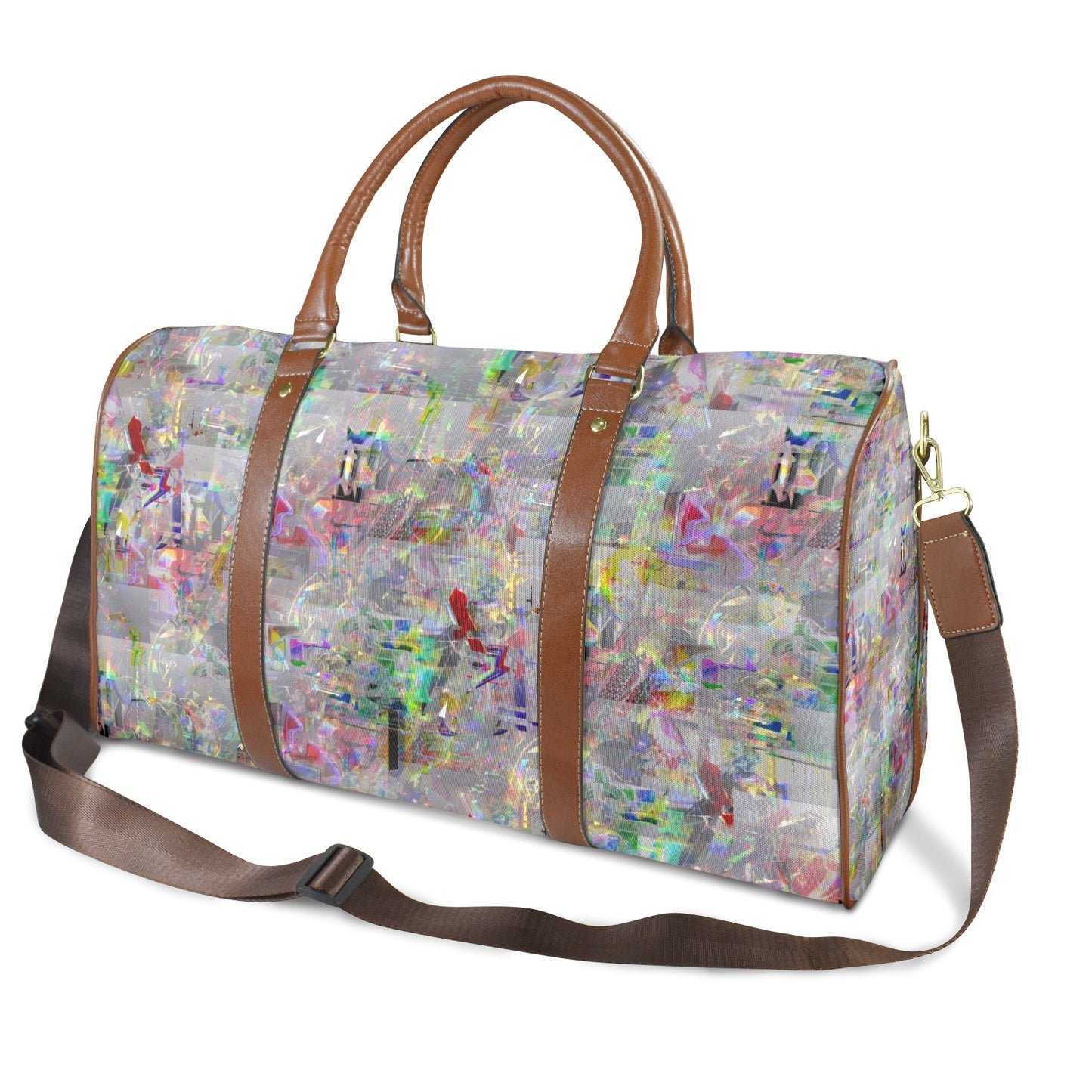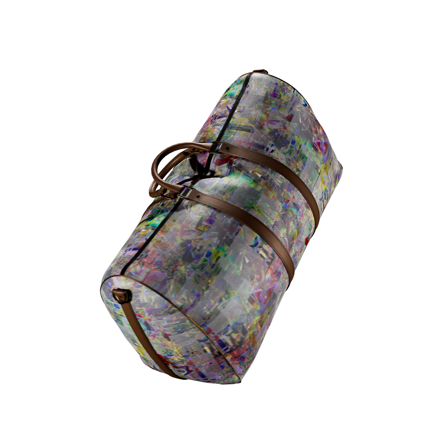 Introducing the Glitchflow Travel Bag—a stunning blend of art and functionality that's ready to accompany you on every journey. Crafted from lightweight yet robust 100% high-grade nylon, this bag features an iridescent glitchy gray overlay design accented with rich brown microfiber PU leather handles and trims. Its spacious interior effortlessly holds a few days' worth of clothing and toiletries, making it the perfect companion for spontaneous getaways and well-planned adventures alike.
